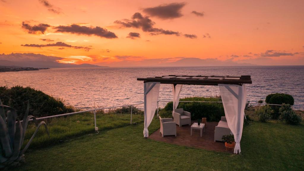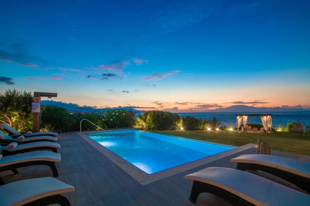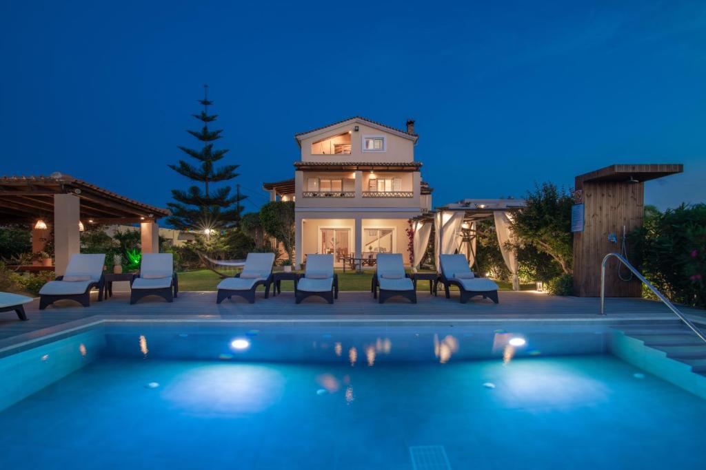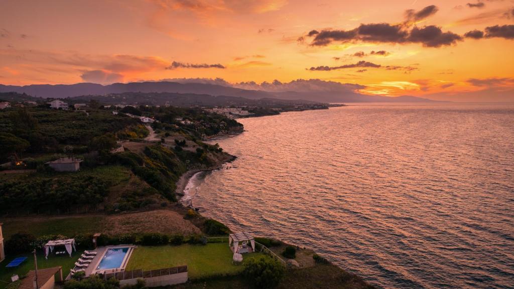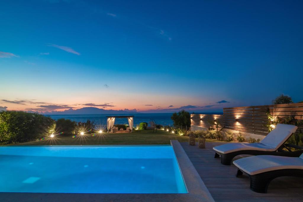 The surrounding spaces of the villa feature outdoor living areas, a spacious beautiful garden with a covered BBQ and a panoramic view, where you can relax and enjoy the deep blue of Ionian Sea and the beautiful sunsets